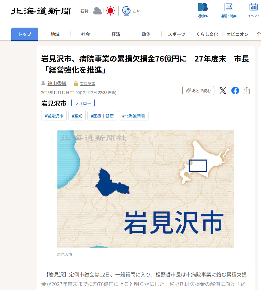 また全国の公立病院は7〜8割が単年度赤字と言われています。公立病院は役割上どうしても赤字になりやすく、今はどの自治体も“このまま続けられる形に作り直す”段階にあるとも言え、岩見沢市も例外ではありません。