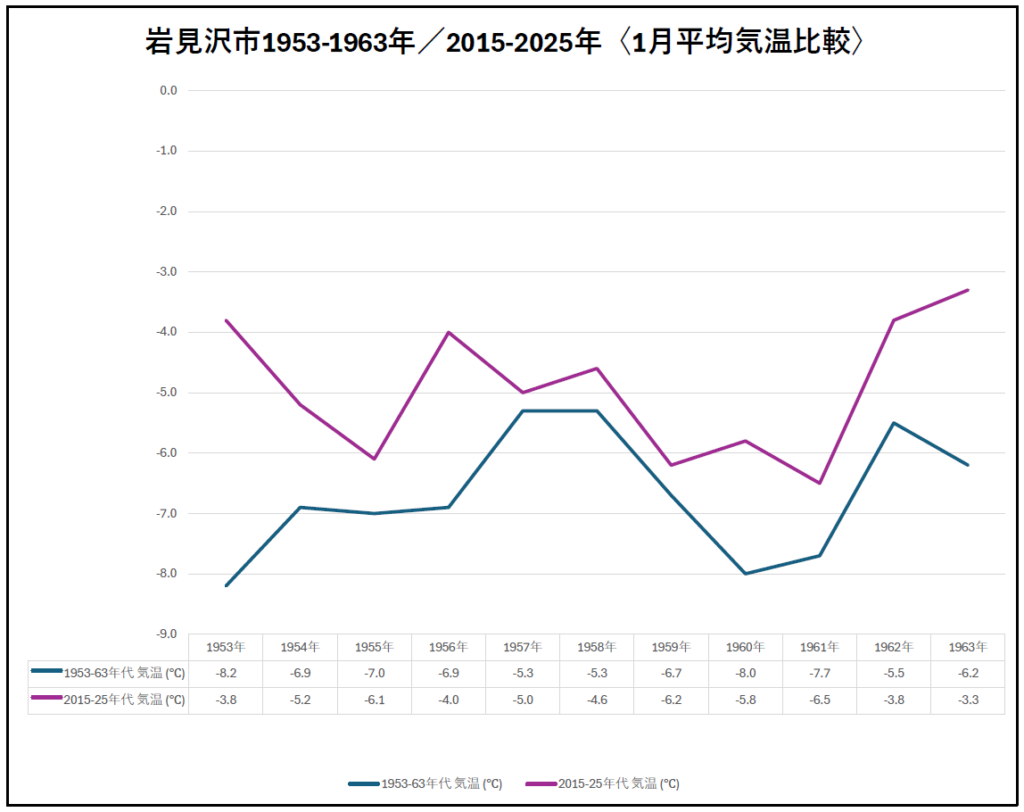 動画中では、1953年1月の平均気温と2025年1月の平均気温で約5℃の差があるという表現をになっていますが、あくまでその2年のみを比較すると5℃という大きな数字になるものの、もう少し全体を俯瞰してみたいと思い、改めて10年単位で比較すると以下の様に1953年からの10年間平均と2015年からの10年間平均の比較では+1.8℃になります。(これらもAIを活用する上で、まだまだ気をつけなければならないところでした。いわゆる切り取る部分で印象が変化する典型といえます。)