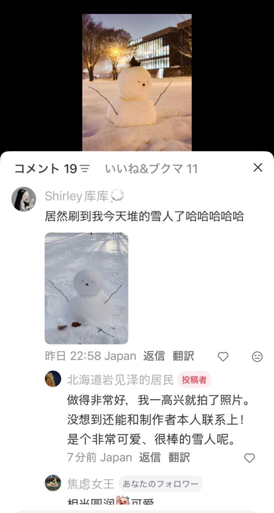 この画像を中国版SNSの「RED」で投稿したら、すぐに下画のように「今日作った雪だるまが写るなんて、ハハハ!という中国人のコメントがつきました。