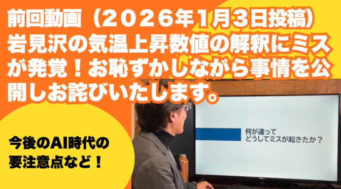 〈令和8年1月9日投稿〉 1月7日のブログで紹介したとおり、3日に公開した動画の数値に誤りがありました。 そこで、お詫びとともに「何が違ったのか?」「どうしてそのようなミスが発生したのか?」ということを解説する動画を作成 … 続きを読む 【再】岩見沢の72年分の気象データをAI分析!