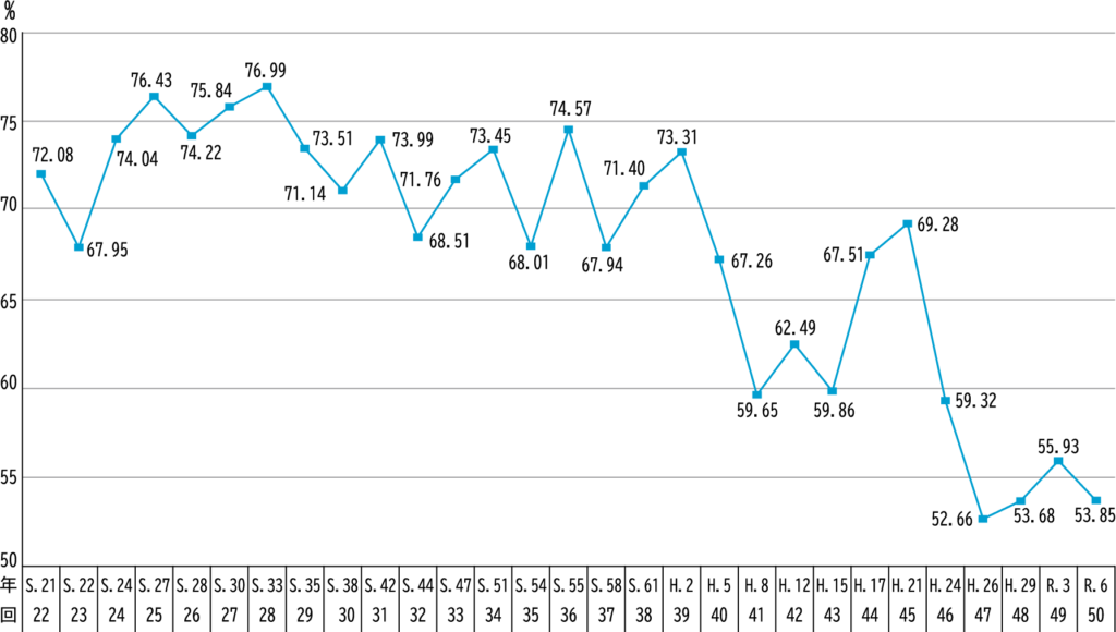 近年の投票率は、報道等でも周知のとおり著しい右肩下がりです。