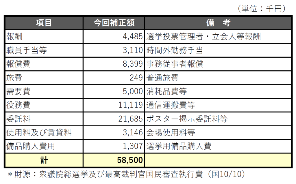 参考までに、今回の衆議院選挙に関する岩見沢市の経費は以下のように総額5,850万円となります。