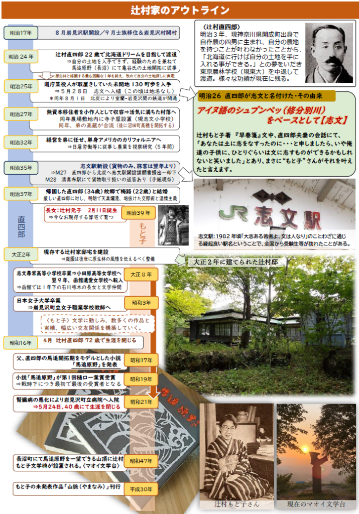 ■志文(しぶん)の地名は、明治26年に直四郎が名付けたと言われ、その由来は「アイヌ語のシュプンペッ(修分別川)を基にしていますが、長女のもと子の作品「早春箋」の文中、直四郎夫妻の会話にて、「あなたは土に志をなすったのに・・・と申しましたら、いや俺達の子供に、ひとりぐらい文に志すものができるかもしれないと笑いました」とあり、まさに”もと子”がそれを叶えたと言えます。